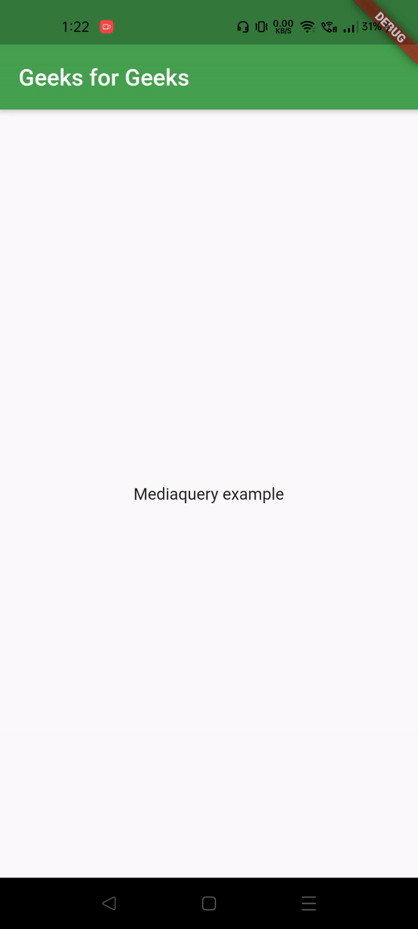 @override Widget build(BuildContext context) { final screenW = MediaQuery.of(context).size.width; print(screenW); return Scaffold( // when screen's width < 600px, // it shows a appbar, when it's above 600px, // it hides it. appBar: screenW <= 600 ? AppBar( title: Text("Geeks for Geeks"), backgroundColor: Colors.green) : null, body: Center( child: Text("Mediaquery example"), ), ); } } |