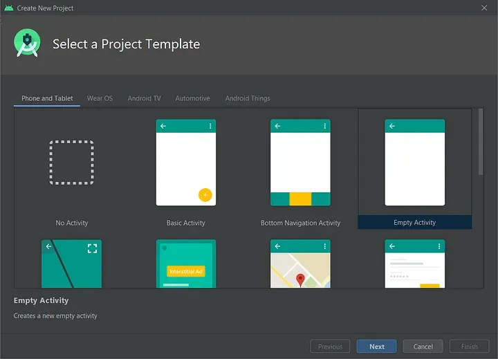- Select a template for your project, such as “Empty Activity” or “Basic Activity”.