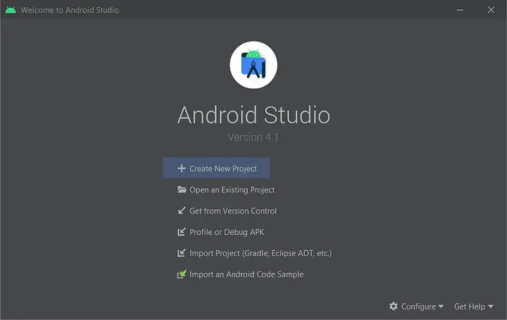 - After the installation is complete, launch Android Studio and select “Start a new Android Studio project” from the main menu.
