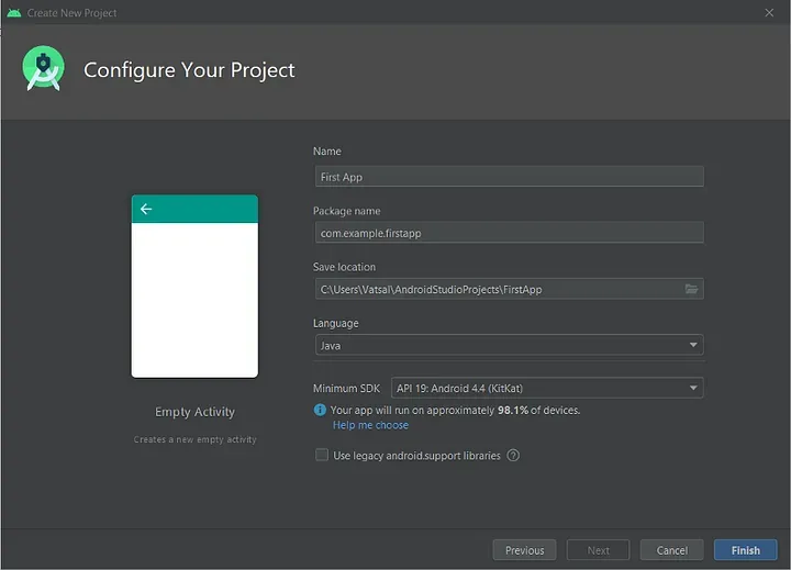 - Choose a project template and configure the project settings, such as the project name, package name, and location.