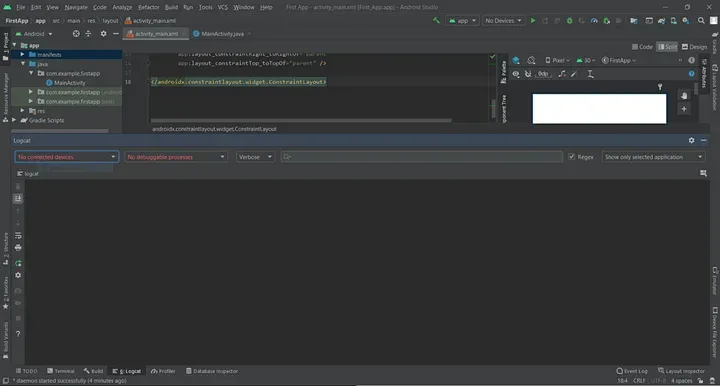A window called Logcat is opened from the Bottom bar, as seen in this image. Because it displays all reports of your app when it is operating on a device or emulator, it is a crucial tool for app development. Discovering the cause of app crashes, which will happen frequently while being developed, is particularly helpful.