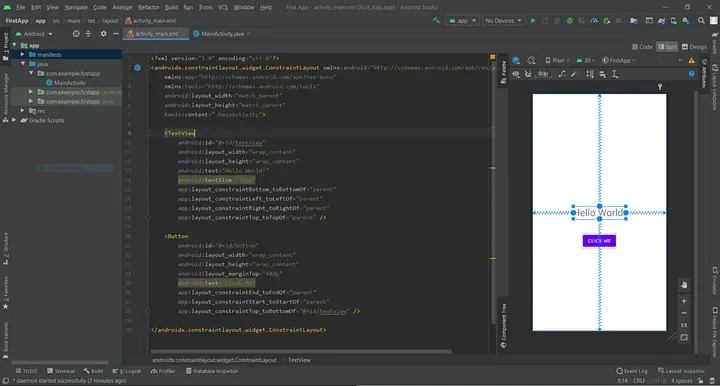 Now, enough of the introduction. Let’s get started building the app as described above. We’ll add a button to the layout and place constraints around it on the sides so that it stays in a fixed position. Also, we would enlarge the text in the existing text view. We will now give the text view and button an ID. Every UI element needs it since it offers them a unique identity to refer to in code and helps them stand out from one another when developing.