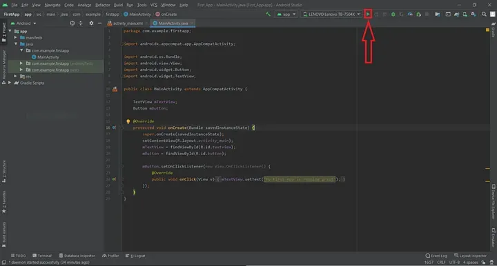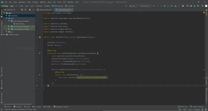 When a button is clicked, we want the text of the text view to change to read, “My First App is running nicely.” We must therefore add “OnClickListener()” to the button in order to listen to button clicks.