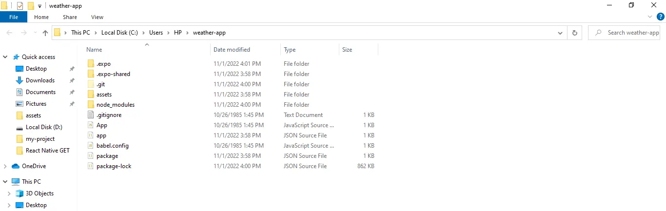 Let’s create a simple React Native app using Expo and name the project as ‘weather app’. We will be using npx-create-expo-app weather-app to create the project. Here look at the reference mentioned in the Local C drive of our desktop file image.