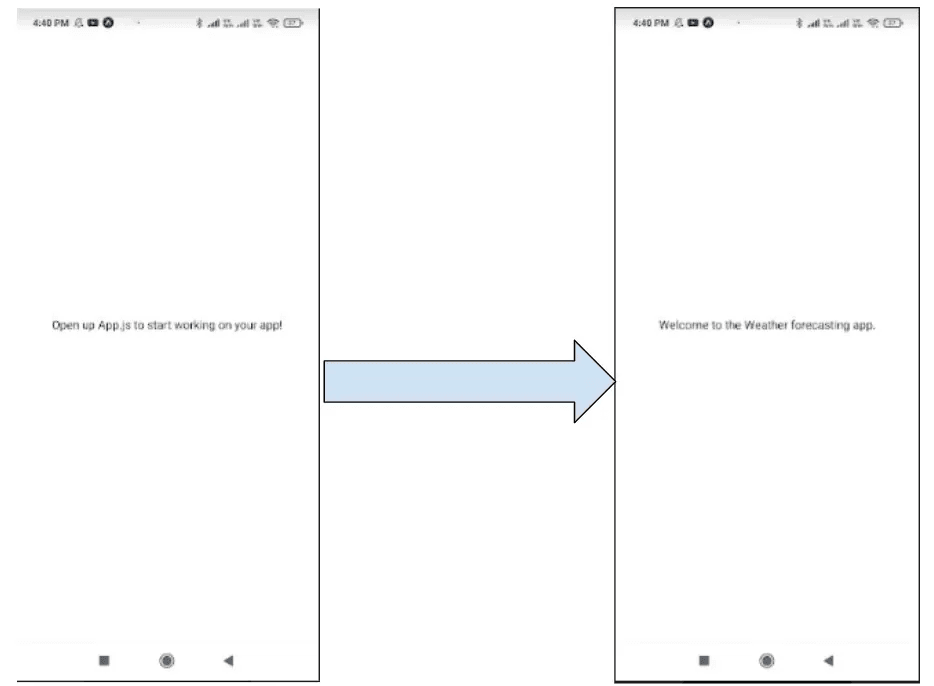 The loading screen will now read “Welcome to the Weather forecasting app.” instead of “Open up App.js to start working on your app!” in this stage.