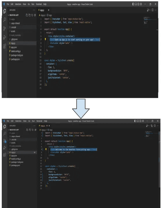 To do this, open the app’s app.js file and modify the <Text>Open App.js to begin developing your app!\/Text>to <Text>Greetings from the weather prediction app.</Text> Take a look at picture 2.
