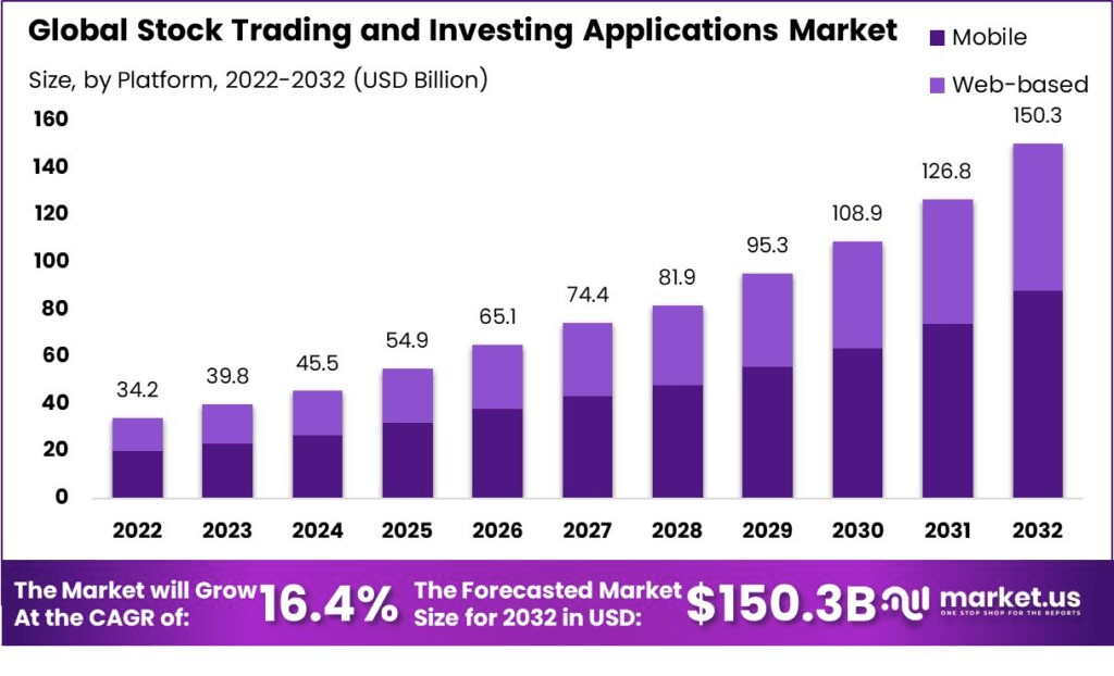 According to sources, the stock trading app market collected a total of 39.8 billion in 2023 and is expected to grow 150 billion by the time we reach 2032 which is a rise of 16.4% of CARG.