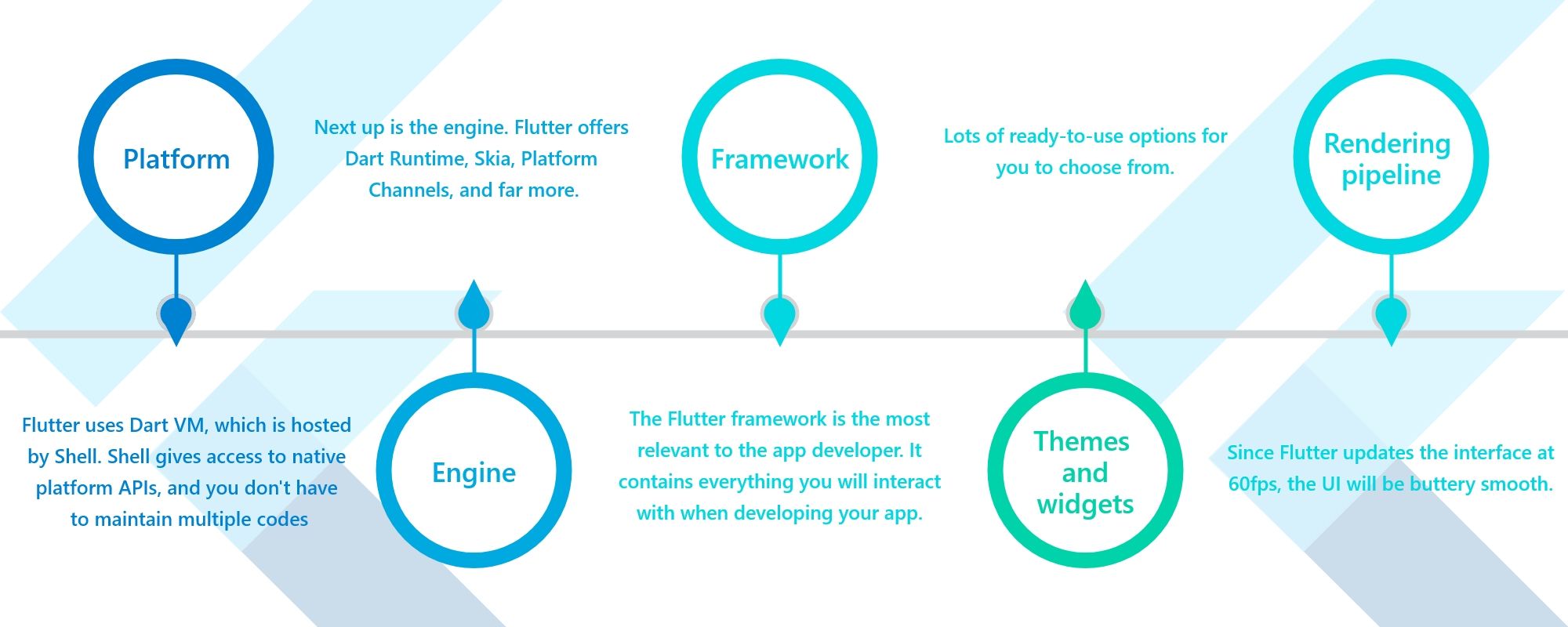 - Platform: Shell hosts the Dart VM that Flutter utilizes. Shell eliminates the need for maintaining several applications and provides access to native platform APIs.