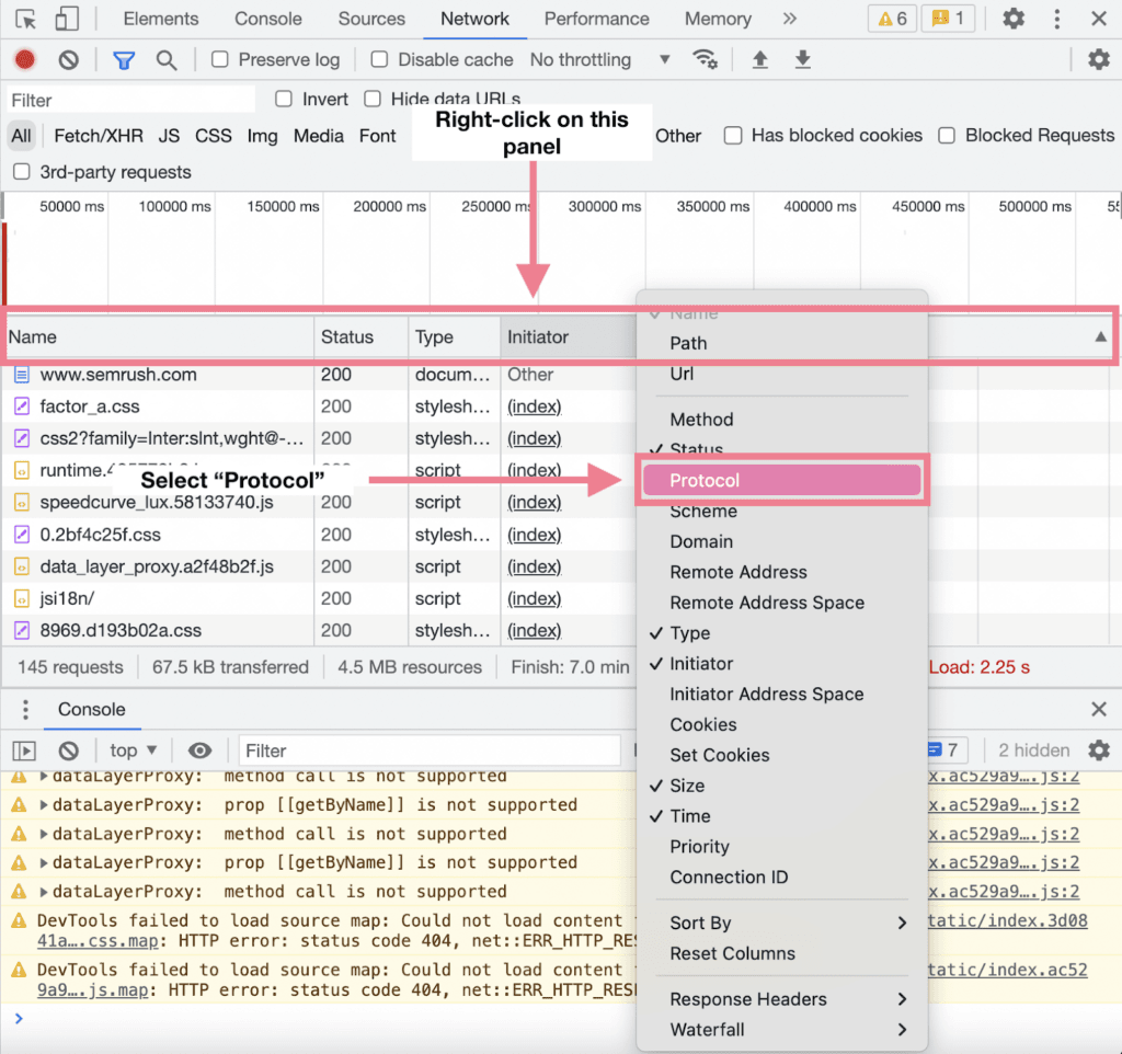 Click “Inspect” when you right-click anywhere on the page in Google Chrome to see the HTTP protocol your website is using. Next, select the “Network” tab.