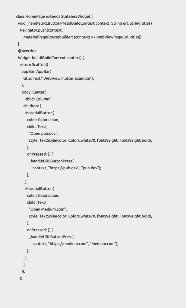 With the context of the parameters, https://medium.com.com (the website URL that the WebView widget will load and render), and Medium.com, the second button, Open Medium.com, will invoke the method _handleURLButtonPress (title of the WebViewPage page).