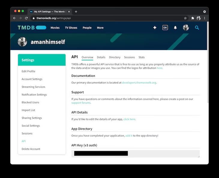 Get the API key by navigating to Settings > API section after logging into your TMDB account and looking for it under the section API Key (v3 auth).