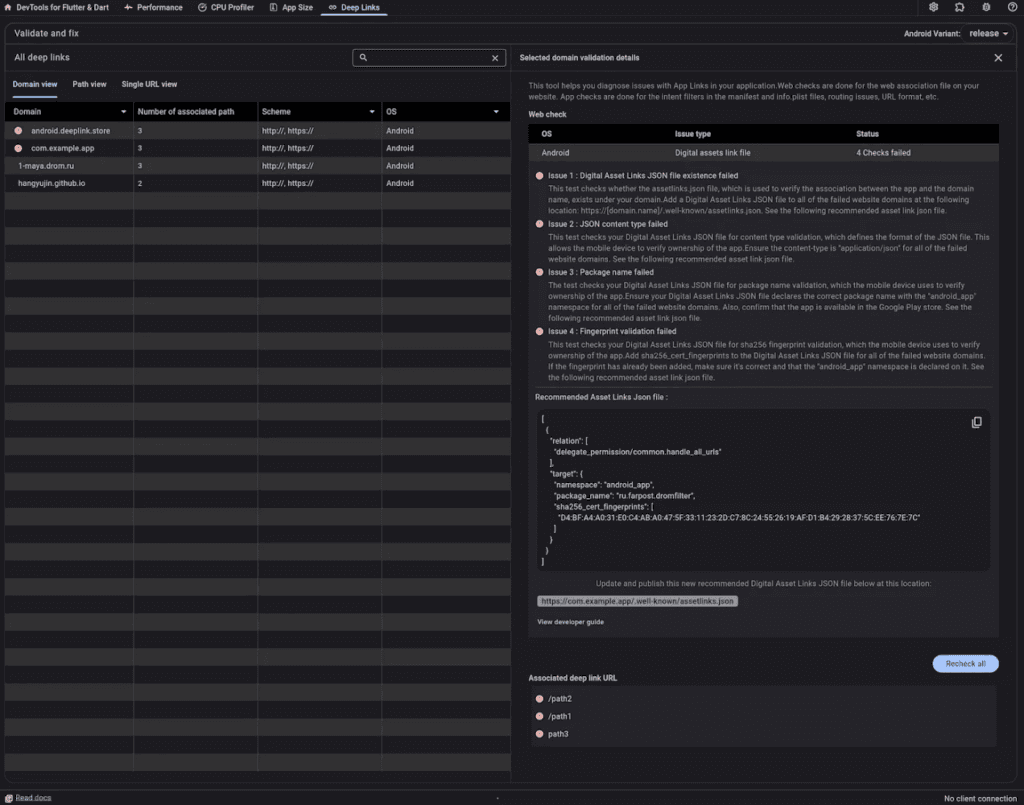 - Open Flutter DevTools, a useful debugging tool for Flutter apps, to utilize that Deep Link Validator.