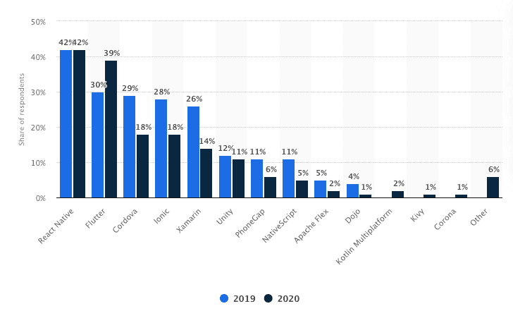 There is a massive range of cross-platform frameworks available to a mobile app development company to choose from. However, React Native has been leading the charts on a year-to-year basis.